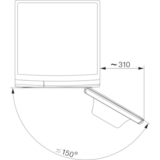 Skizze eines Monitors im Profil. Angegeben sind Maße von ca. 310 und ein Öffnungswinkel von ca. 150 Grad.